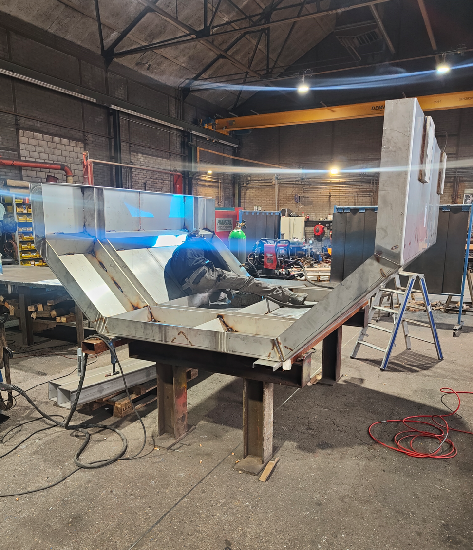 Leistungsbeschreibung: Abdeckhaube aus CN-Stahl Leistungsumfang: Planung, Fertigung und Montage einer Abdeckhaube aus CN-Stahl Ausführung: beidseitig öffnend Konstruktion: • Feste Seitenteile, verbunden mit einer festmontierten Auffangwanne • Bewegliche Flügel, inklusive festmontiertem Abweisblech Oberflächenbehandlung: Stahlkonstruktion grundiert mit Rostschutzfarbe in «Rot»
